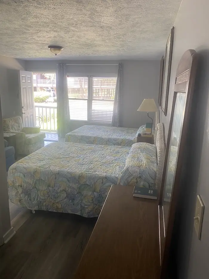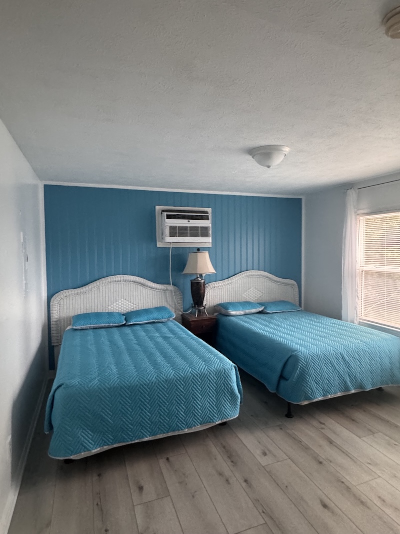 This room features two double beds, bathroom with shower and tub, sofa, television and a large kitchen table for families to gather around and eat.  It also has a refrigerator, microwave, stove, and dishes/utensils are provided.  (Max Occupancy 4 People)