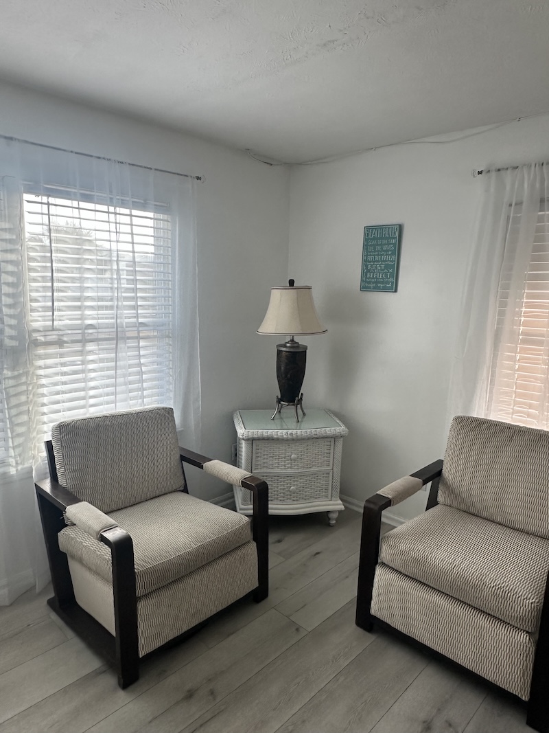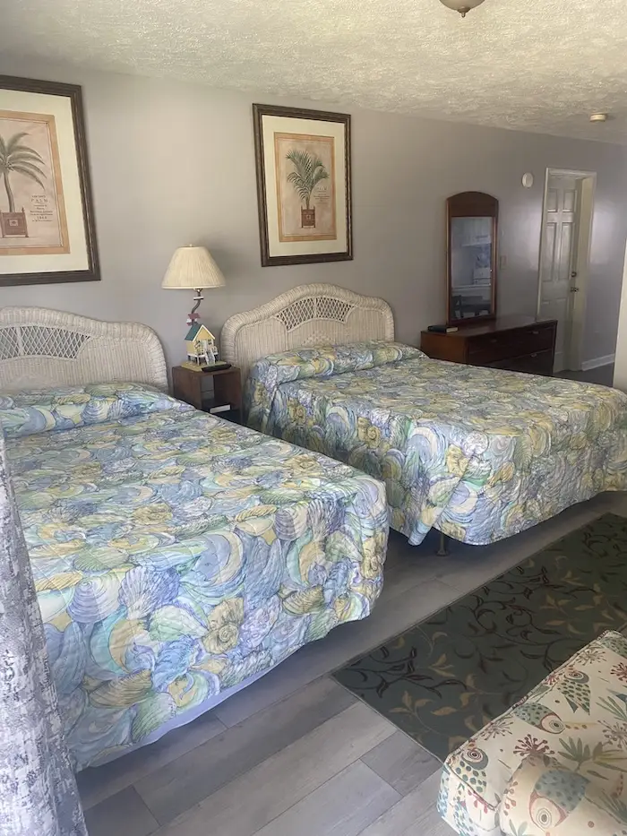 As you enter the room you will find a sitting area where you can relax and watch TV as well as have an afternoon snack after coming off the hot Beach.  A small hallway takes you into the bathroom and a back bedroom where you will find two double beds.