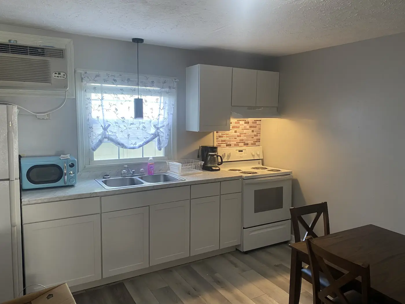 This unit is located upstairs just above the office apartment. This is also another popular room. When you first enter you’ll find a loveseat recliner television all within the kitchen area which features a refrigerator, stove, microwave, kitchen utensils and then there’s a full bathroom and in the back room two double beds.